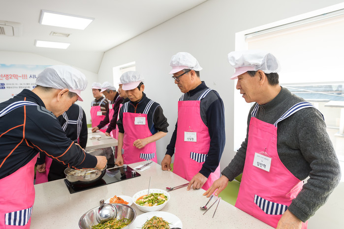 ▲65세이상 할아버지 대상으로 하는 요리프로그램 '시니어 영양교실'의 모습.(양천구 제공) |