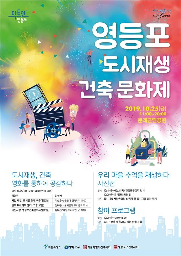 또한 오후 3시부터 8시까지 ‘도시재생, 건축 영화제’가 열린다. 상영작은 모두 도시재생 및 건축과 관련한 영화로 선정했으며, △시민 제인: 도시를 위해 싸우다 △월드 트레이드 센터, 그 후 △대신시장-영등포건축문화유산으로 총 3편의 영화가 상영된다.