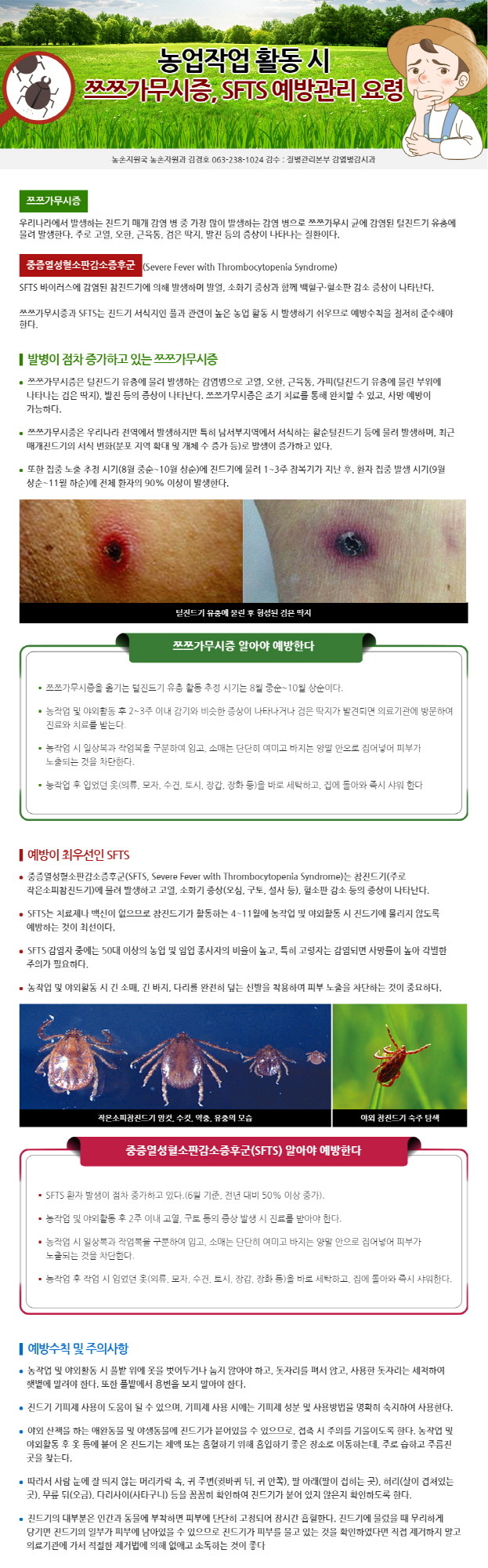 쯔쯔가무시증은 9월 상순에서 11월 하순에 전체 환자의 90%이상이 발생하고, 고열·오한·근육통과 함께 검은 딱지와 발진 등 증상을 동반한다. 농작업이나 야외활동 후 감기증상이나 검은 딱지가 발견되면 즉시 의료기관을 방문해 조기에 치료를 받아야 한다.