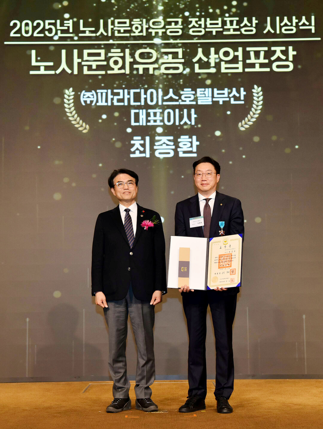 지난 30일 서울 용산구 피스앤파크 컨벤션에서 진행된 고용노동부 주관 ‘2025 노사문화유공 정부포상 시상식’에서 최종환 파라다이스 호텔 부산 대표이사(우측)가 산업포장을 수훈하고 있다. 파라다이스 제공