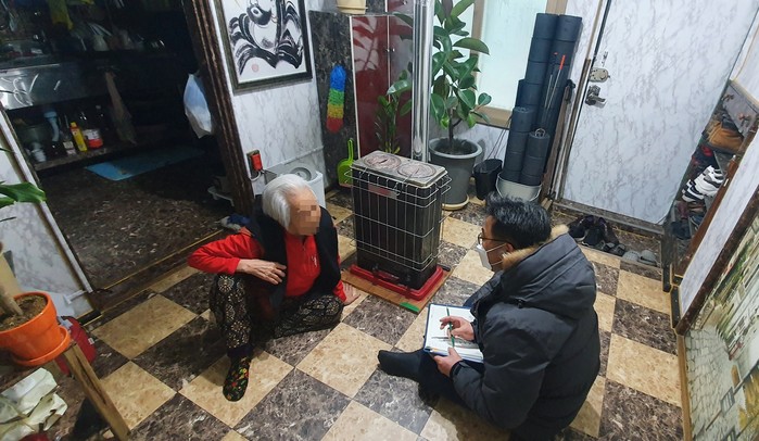 | ▲김범수 수원시 복지자원팀장이 연무동에 거주하는 한 어르신 가정을 방문해 배달된 연탄을 확인한 후 지원 취지를 설명하고 있다.(수원시 제공) |