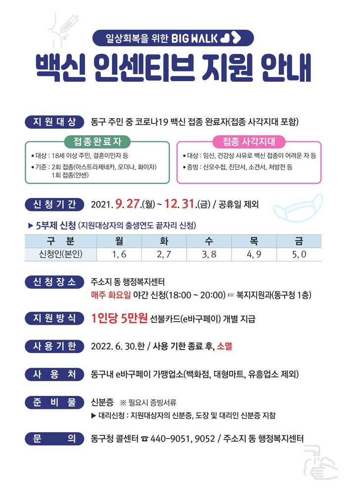 오는 9월 27일부터 12월 31일까지 만18세 이상 접종대상자 중 코로나 백신접종을 2차(얀센 1차)까지 완료한 주민에게 1인당 5만원씩 ‘e바구페이’로선불카드를 지급한다.