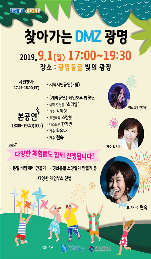 9월 1일 오후 5시부터 광명시 광명동굴에서 열리는 '찾아가는 DMZ'행사는 DMZ의 가치를 알리고 평화통일을 염원하는 통일바람개비 만들기, DMZ식물 그림엽서 만들기, 평화통일 소망열차 만들기 등 각종 체험부스를 운영한다.
