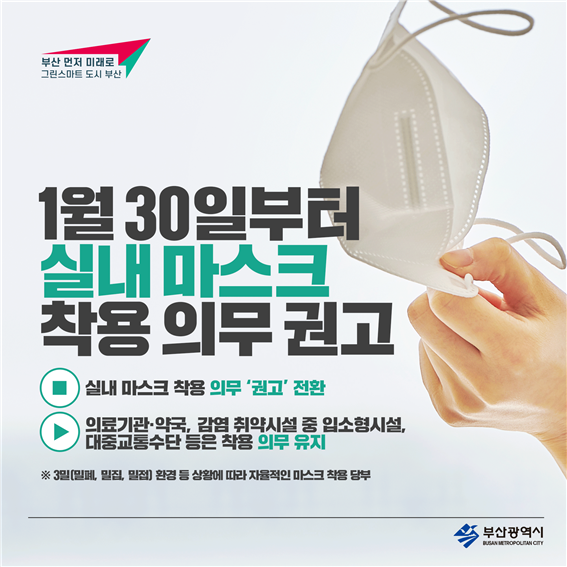 [로컬세계 부산=맹화찬 기자]부산시(시장 박형준)는 오는 30일부터 마스크 착용 의무화 행정명령을 변경 발령하고, 실내마스크 착용을 ‘의무’에서 ‘권고’로 전환한다고 밝혔다.