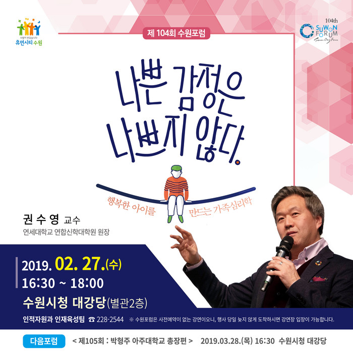 수원포럼에서 권수영 교수는 ‘나쁜 감정은 나쁘지 않다’를 주제로 분노, 짜증, 미움 등 ‘나쁜 감정’이라고 불리는 여러 감정에 대한 다양한 변론을 제시한다.