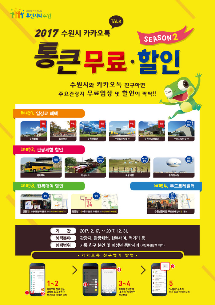 모바일 메신저 카카오톡에서 수원시와 친구를 맺으면 수원시 주요 관광지와 관광체험 시설을 무료·할인 가격으로 이용할 수 있는 이벤트다.