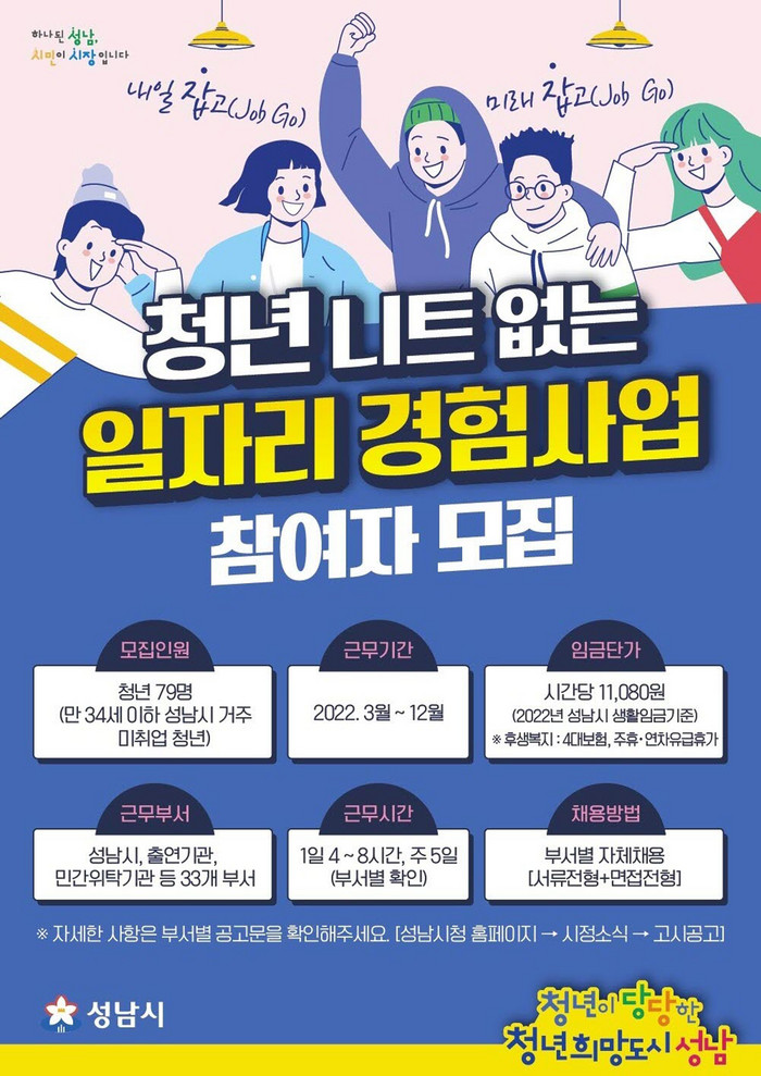 [로컬세계 김병민 기자]경기 성남시가 4일~18일 ‘청년 일자리 경험사업’ 참여 희망자 79명을 모집한다.