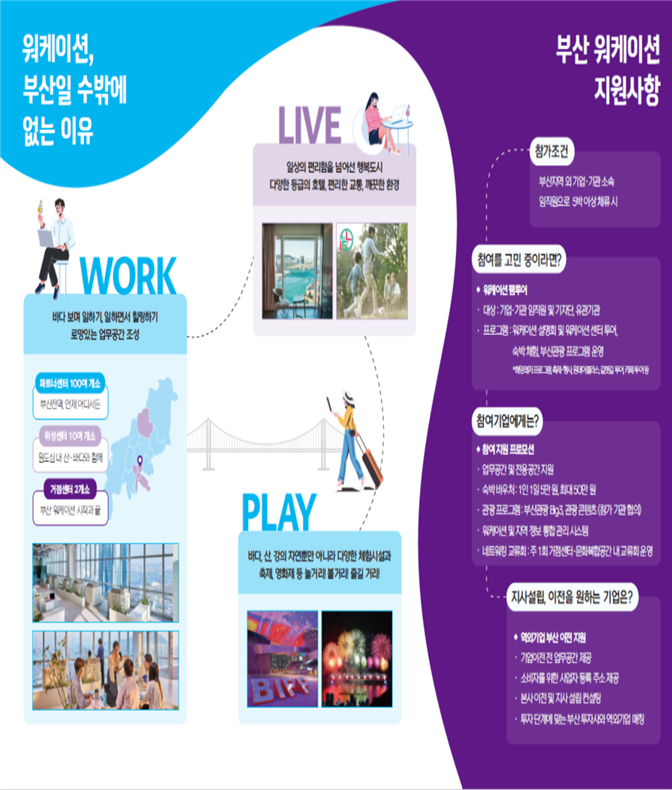 [로컬세계 부산=전상후 기자]부산시는 오는 7일 오후 일(Work) 삶(Live) 쉼(Play)이 조화로운 도시 부산을 위한 ‘부산 워케이션 거점센터’ 개소식을 부산역 인근 아스티호텔 24층에서 개최한다고 6일 밝혔다.