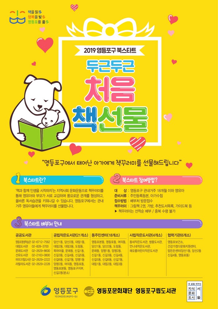 ‘생애 첫 책, 북스타트 책 꾸러미’는 영등포에 거주하고 있는 18개월 이하 영유아를 대상으로 한다. 책 꾸러미는 구 선정도서 2권과 가방, 추천도서 목록, 가이드북 등으로 구성돼 있다.