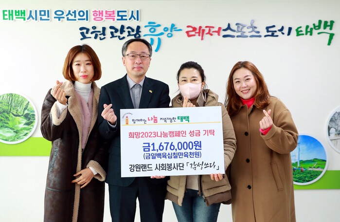 [로컬세계=김병민 기자] 강원랜드 사회봉사단 캘리그래피 ‘감성 쓰다’는 지난 1월 31일 태백시청을 방문해 희망2023 나눔캠페인 이웃돕기성금 167만6000원을 기탁했다.