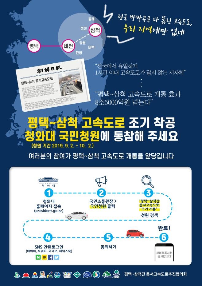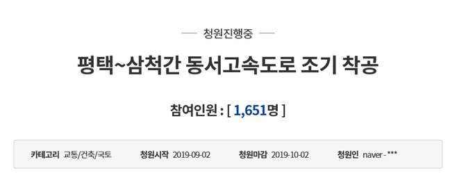 이번 청원에는 1997년 평택∼삼척 동서고속도로 착공 이후 2015년 평택∼제천구간(127.3㎞)은 연결됐지만 나머지 구간인 제천∼태백∼삼척 구간(123.2㎞)이 아직 답보 상태에 머물러 있는 것에 대한 답답한 지역민심이 담겨있다.