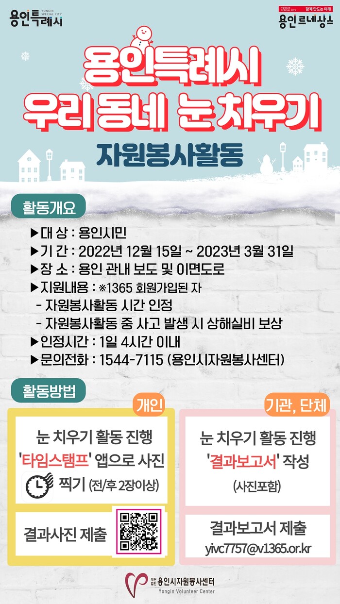 활동 방법은 '1365 자원봉사포털' 사이트에 회원가입 후 '용인시 자원봉사활성화시스템'에 제설 활동 전후 사진을 전송해야 한다.