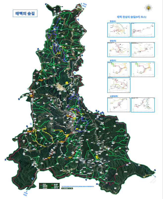 시는 걷기 좋은 천상의 숲길 9개 코스를 우선 선정했으며, 숲길 전체지도에는 천상의 숲길을 중심으로 지도상에 표시되지 않은 태백의 다양한 숲길까지 상세히 담겨있다.