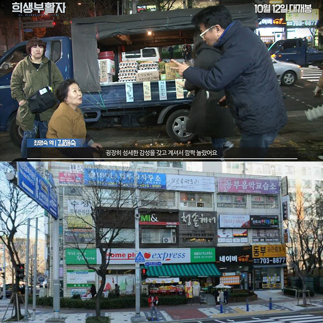 영화 '희생부활자' 제작 증언 영상에서는 부산 해운대구 좌동에 위치한 네이버 부동산 맞은편 계란을 실은 트럭을 배경으로 곽경택 감독이 김해숙에게 디렉션을 하는 장면이 공개됐다.