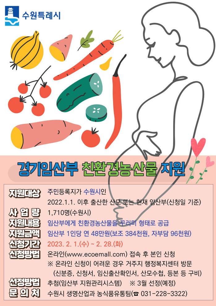 수원시는 ‘2023년 경기임산부 친환경농산물 지원사업’에 참여할 임산부 1710명을 오는 28일까지 모집한다.