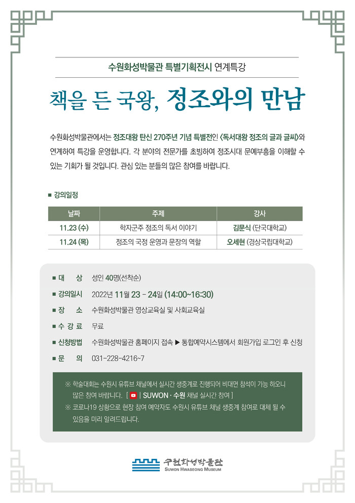23일에는 김문식 단국대 교수가 ‘학자군주 정조의 독서 이야기’를, 24일에는 오세현 경상국립대교수가 ‘정조의 국정 운영과 문장의 역할’을 주제로 강의한다. 특강은 수원시 공식 유튜브 채널(유튜브 검색창에서 ‘수원시’ 검색)에서 실시간으로 중계한다.