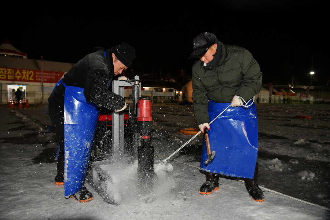 [로컬세계 = 전경해 기자] 24일, 화천산천어축제장에서 관광객이 몰리는 주말을 맞아 새벽부터 얼음구멍을 뚫는 작업이 진행되고 있다. (사진=화천군 제공)