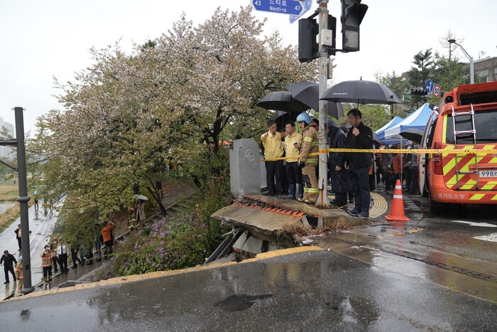 [로컬세계=김병민 기자]경기 성남시는 5일 오전 분당구 정자동에 위치한 정자교 인도 쪽 부분 50m 가량이 붕괴돼 행인 1명이 사망하고, 1명이 중상됨에 따라 긴급 브리핑을 가졌다.
