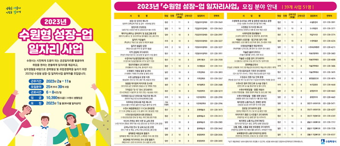 수원시는 ‘2023년 수원형 성장-업 일자리사업’에 참여할 구직자 51명을 1월 중에 모집한다.