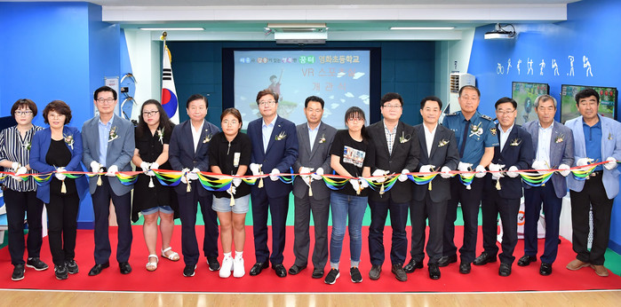 | ▲염태영 수원시장(왼쪽에서 일곱 번째)이 ‘영화초등학교 ‘VR(가상현실) 스포츠실’ 개관식’에서 관계자들과 함께 테이프 커팅을 하고 있다.(수원시 제공) |