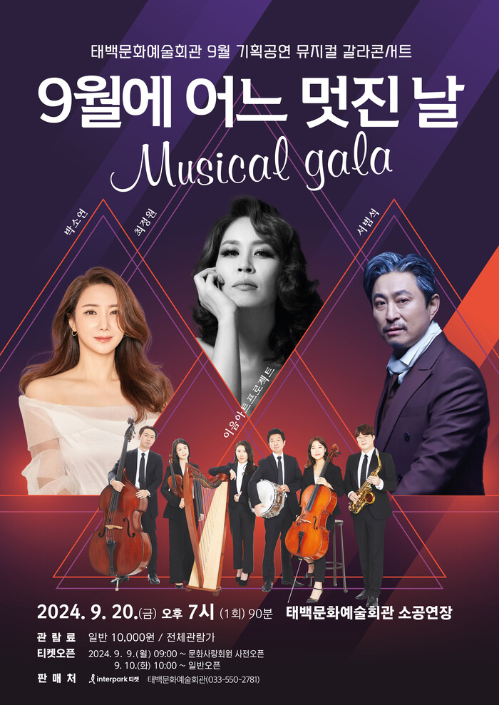 [로컬세계=박상진 기자]강원 태백시는 오는 20일 오후 7시 태백문화예술회관 소공연장에서 9월 기획공연 뮤지컬 갈라 콘서트 ‘9월의 어느 멋진 날’이 개최된다고 2일 밝혔다.