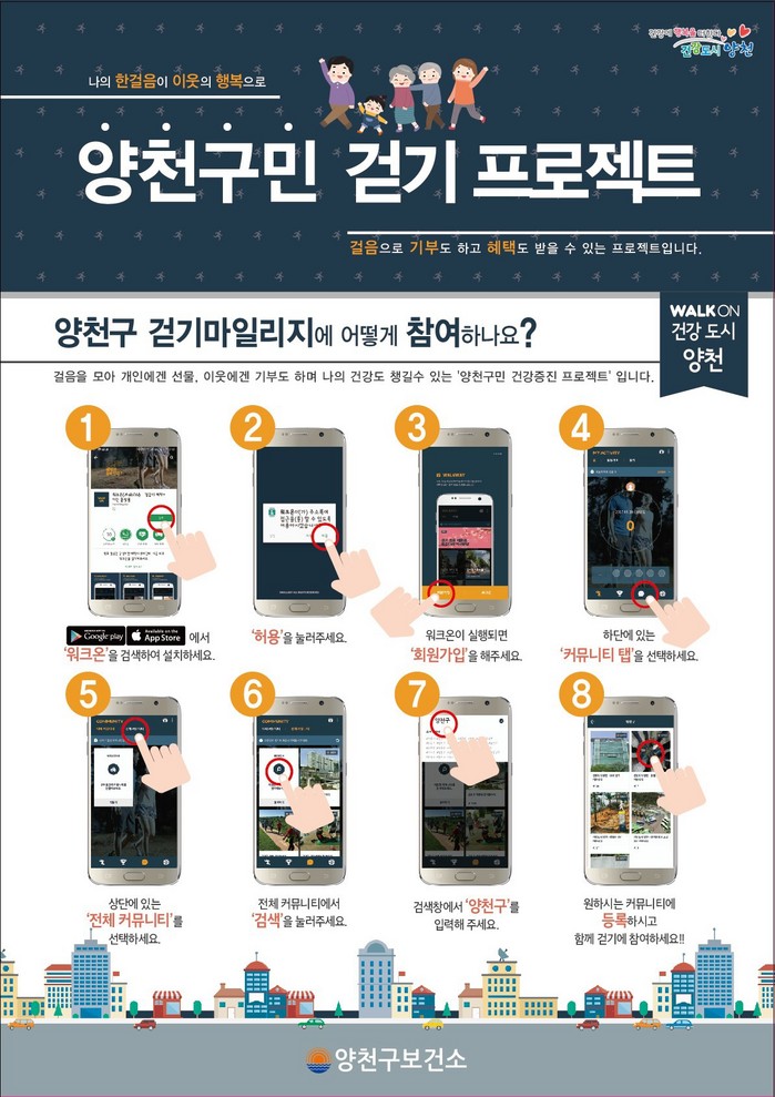 정유진 양천구 보건소장은 “건강증진, 즐거움, 기부의 삼박자를 모두 챙길 수 있는 걷기 마일리지 프로젝트에 많은 주민들이 참여해 주길 바라며 건강하게 오래 잘 사는 웰빙도시 양천을 만들기 위해 최선을 다하겠다”고 밝혔다.