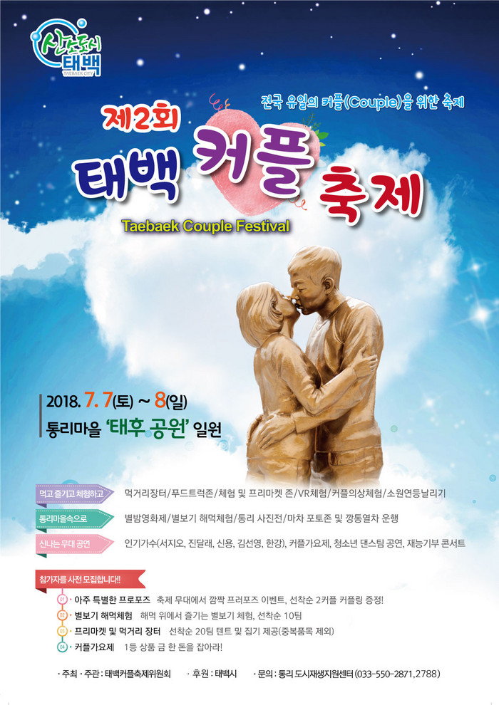 2일 시에 따르면 ‘전국 유일의 커플을 위한 축제’를 슬로건으로 지난해 처음 개최된 태백 커플 축제는 ‘전국에서 가장 데이트하기 좋은 축제’를 목표로 다양한 프로그램을 알차게 준비했다고 설명했다.