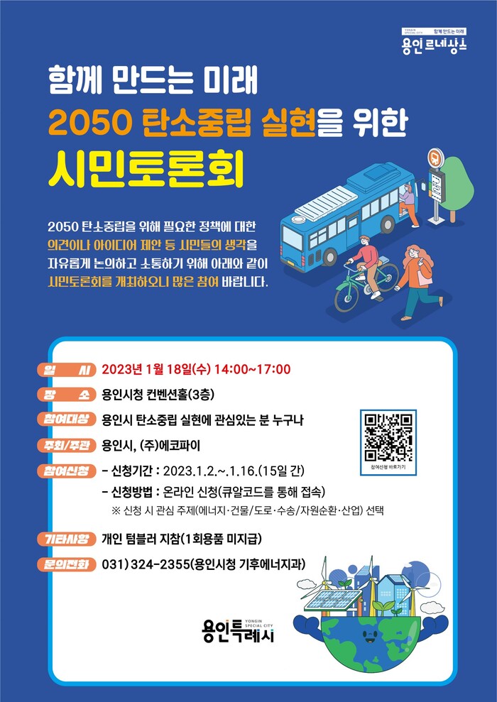 [로컬세계=김병민 기자]경기 용인특례시가 2050 탄소중립 실현을 위한 시의 비전과 실천방안을 모색하기 위해 18일 열리는 시민토론회의 참여자 80명을 모집한다고 5일 밝혔다.