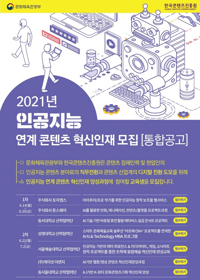 문화체육관광부와 한국콘텐츠진흥원은 미래 콘텐츠산업 혁신을 이끌 ‘2021년 인공지능 연계 콘텐츠 창의인재 양성사업’에 참여할 교육생을 모집한다.