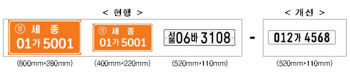 가령, 영업용 차량의 경우 기존에는 주황 표지판에 ‘ 경기 01가5001’로 표기되었던 것이 개편한 표기 방법을 적용하면 주황 표지판에 검은 글씨로 ‘012가5001’로 표기된다. 비영업용 차량은 흰 표지판에 ‘012가3456’으로 표기된다.