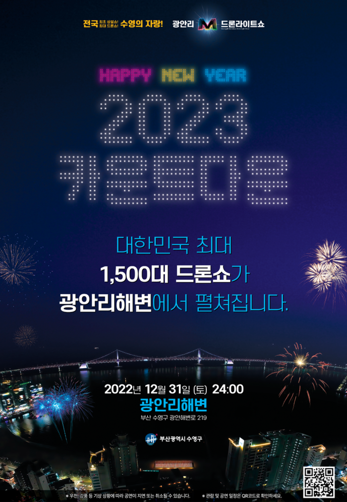강성태 수영구청장은 “지난 4월부터 본격적으로 시작된 광안리 M 드론라이트쇼 상설공연이 벌써 9개월을 맞이하였고, 유동인구 분석 결과 130만명의 관광객들이 드론쇼를 관람했으며 지역상권 매출액 또한 크게 증가한 것으로 분석되고 있다. 지난 9개월간 광안리에서 상설쇼를 운영한 노하우를 바탕으로 31일 개최되는 국내 최대 규모의 1,500대 드론으로 신비롭고 경이로운 공연을 선사해드리겠다”고 전했다.