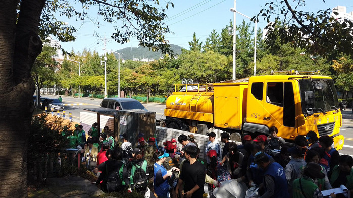 일제대청소 참여자들은 부산원아시아페스티벌의 성공을 기원하는 마음으로 쓰레기를 수거하고 먼지로 뒤덮인 지저분한 보행로를 깨끗이 씻어냈다.