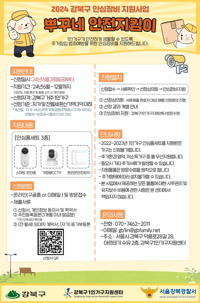 선정 결과는 개별 안내하며 안심장비는 방문수령 할 수 있다. 기타 자세한 사항은 강북구 1인가구지원센터(070-7462-2011)로 문의하면 안내 받을 수 있다.