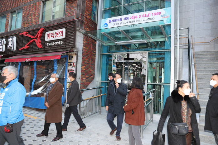 [로컬세계 맹화찬 기자]부산 중구는 중앙동4가 40-10번지 40계단 문화관광테마거리 일원에 있던 소라계단 자리에 엘리베이터를 만들어 지난 6일 개통했다.