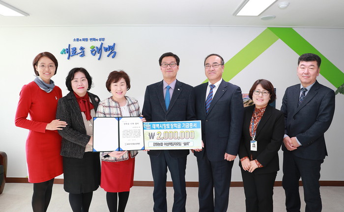 ▲지난 6일 태백시청을 찾은 강원농협 여성책임자모임 ‘솔회’는 향토인재육성 장학금 200만원을 기탁하면서 기념사진을 찍고 있다.(태백시 제공) |