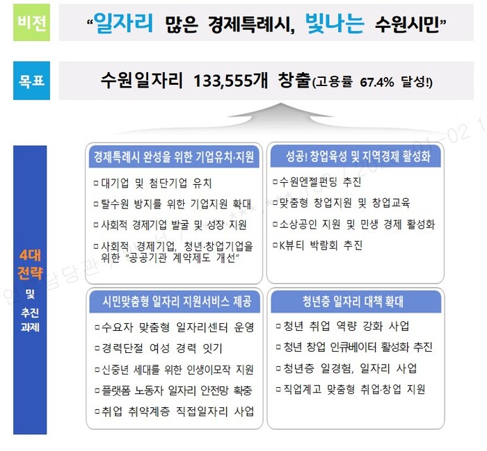 추진 과제는 대기업·첨단기업 유치, 탈수원 방지를 위한 기업지원 확대, 수원엔젤펀딩 추진, 수요자 맞춤형 일자리센터 운영, 경력 단절 여성 경력 잇기, 청년 취업역량 강화 사업 등이다.