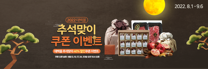 추석맞이 할인 이벤트 행사는 전 상품 1만원 이상 구매 시 40% 할인(최대 2만원 할인) 쿠폰을 선착순 100명에게 발급하며, 쿠폰은 8월(10, 17, 24, 31)일 매주 수요일 10시에 오픈된다.