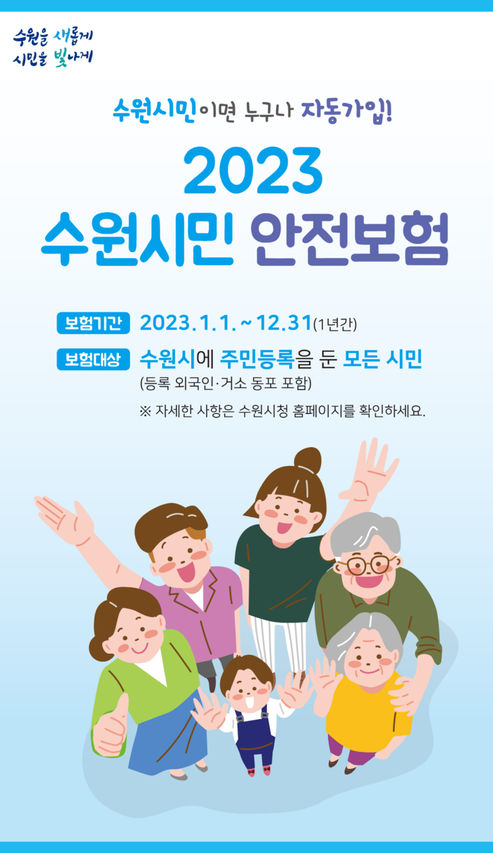 [로컬세계=김병민 기자]경기 수원시가 예기치 못한 화재, 안전사고 등을 당한 수원시민(등록 외국인·거소 동포 포함)에게 보험금을 지급하는 ‘2023년 수원시민 안전보험’에 가입했다. 수원시민은 보험에 자동 가입되고, 보장 기간은 12월 31일까지다.