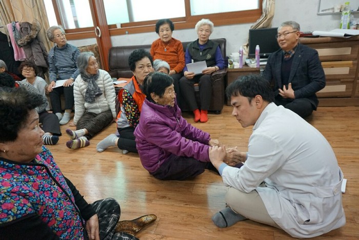 ▲정일원 경희으뜸한의원 원장이 어르신들의 진맥을 짚고 있다.(태백시 제공) |