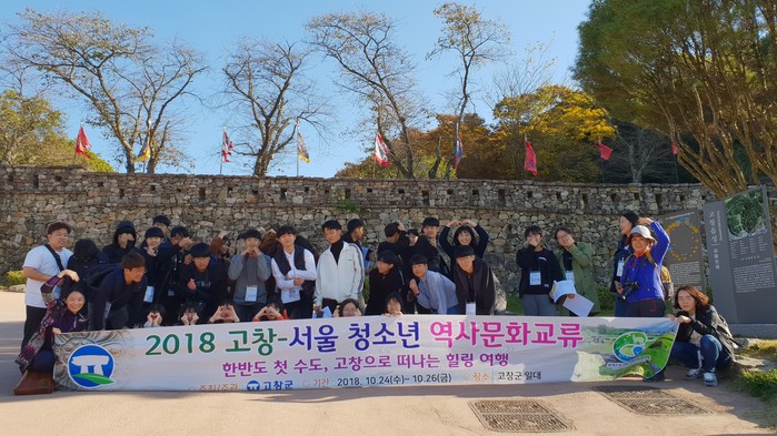 ▲고창군이 지난 24~26일까지 사흘간 서울지역 6개교 40여 명의 청소년과 지도자들을 초대해 ‘2018 고창-서울 청소년 역사문화교류사업’을 진행했다. 참여한 학생들이 기념촬영을 하고 있다.(고창군 제공) |