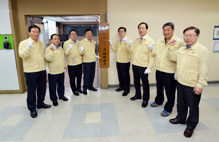 ▲풍수해재난안전 대책본부 개소식에 참석한 유덕열 동대문구청장(가운데 오른쪽)과 동대문구 간부들이 안전한 동대문구를 외치며 화이팅 포즈를 취하고 있다. |