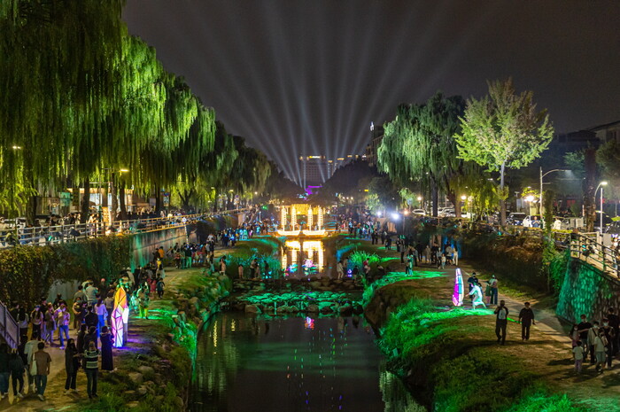 | ▲ 지난 10월 수원화성 일대에서 미디어아트쇼가 진행된 가운데 시민들이 빛으로 물든 수원천을 걷고 있다. |