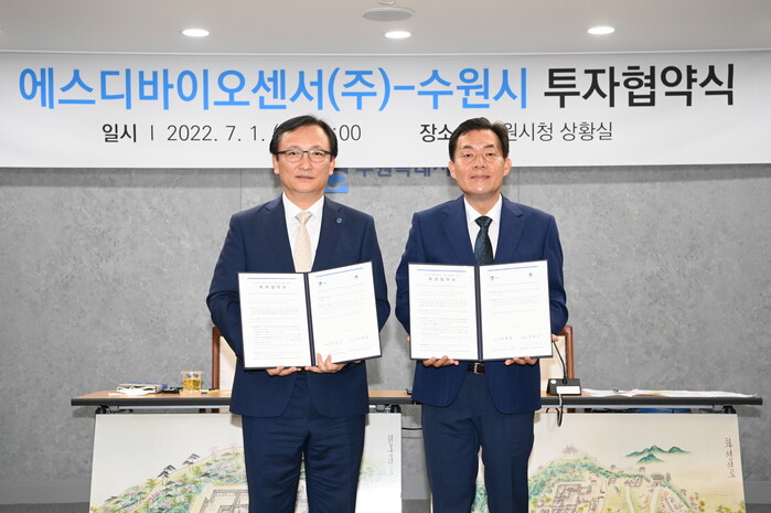 | ▲ 지난 7월1일 수원시청에서 이재준 수원특례시장(오른쪽)과 이효근 에스디바이오센서 대표이사가 협약서를 들고 기념촬영을 하고 있다. |