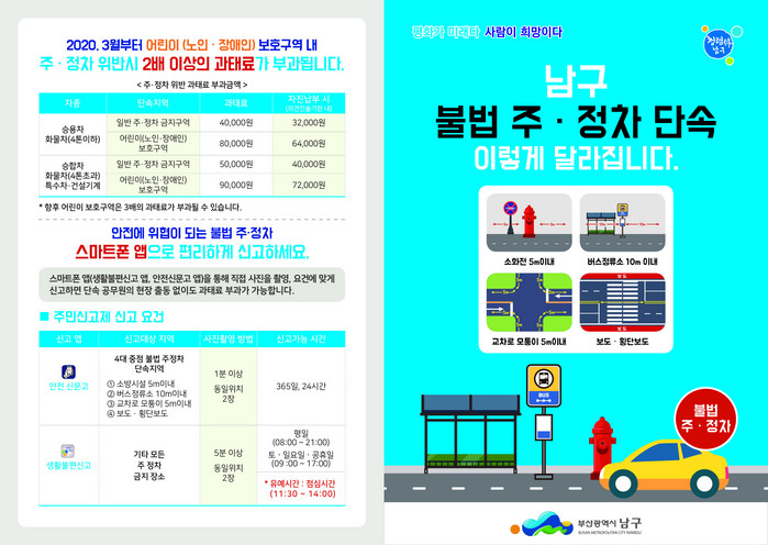 [로컬세계 맹화찬 기자]부산 남구(구청장 박재범)는 오는 3월 1일부터 개학시기에 맞춰 어린이 안전사고 예방을 위한 어린이보호구역 내 주정차 위반 차량에 대해 일반구역의 2배(승용차 기준 8만원, 승합차 9만원)의 과태료를 부과할 예정이다.