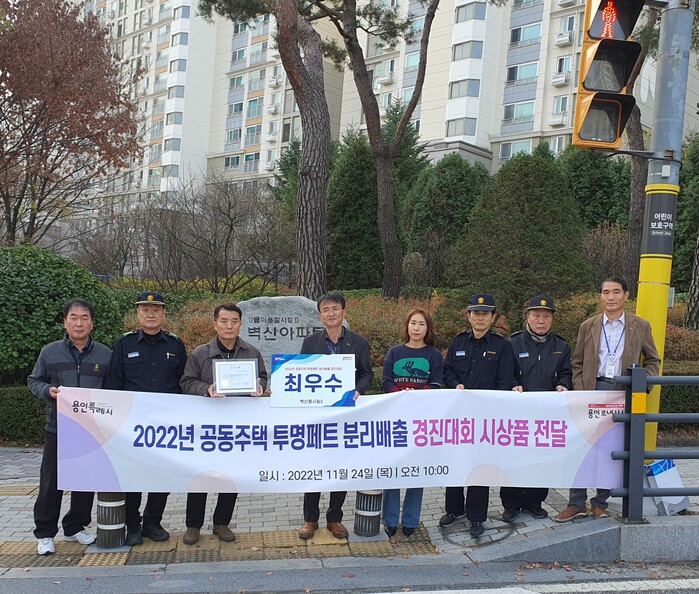 | ▲ 투명페트 분리배출 우수 아파트로 선정된 벽산첼시빌 아파트 관계자들이 기념촬영을 하고 있다. 용인시 제공 |