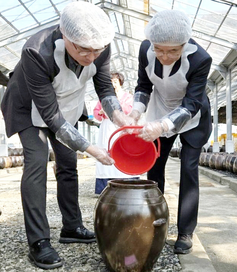 장상우 농협경제지주 마트상품부장(왼쪽)과 이종수 지평농협 조합장(오른쪽)이 지난 20일 경기도 양평 지평농협에서 개최한 '전통 장 담그기' 체험행사에 참여해 항아리에 소금물을 붓고 있다.
