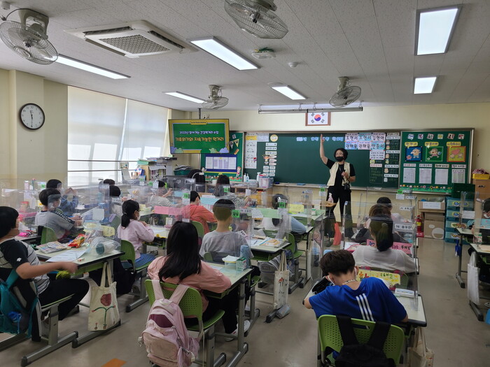 | ▲ 초등학생들이 ‘2022년 찾아가는 건강먹거리 수업’을 듣고 있다. 수원시 제공 |