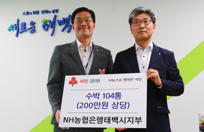 [로컬세계 박상진 기자]강원 태백시는 NH농협태백시지부가 지난 8일 태백시청을 찾아 류태호 시장에게 지역 내 경로당에 전해 달라며 200만원 상당의 수박 104통을 기탁했다고 9일 밝혔다.