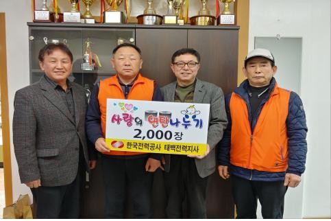 [로컬세계 박상진 기자]한국전력공사 강원 태백전력지사는 임직원 5명이 지난 5일 상장동 행정복지센터를 찾아 사랑의 연탄 2000장을 기부했다고 6일 밝혔다.