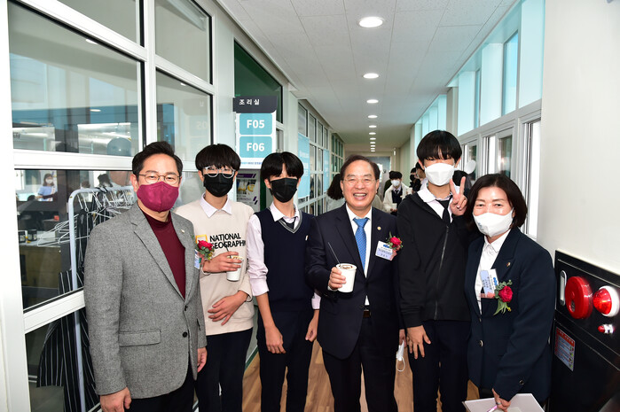 ▲하윤수(가운데) 부산시교육감은 25일 남구 대연동에 있는 남부창의마루에서 열린 '2022년 창의융합 한마당 개막식'에 참석한 직후 박수영(남구갑, 국민의힘, 왼쪽에서 첫번째), 정태숙(남구2, 맨 오른쪽) 시의원, 행사에 참석한 학생들과 함께 기념촬영을 하고 있다. 부산시교육청 제공 |